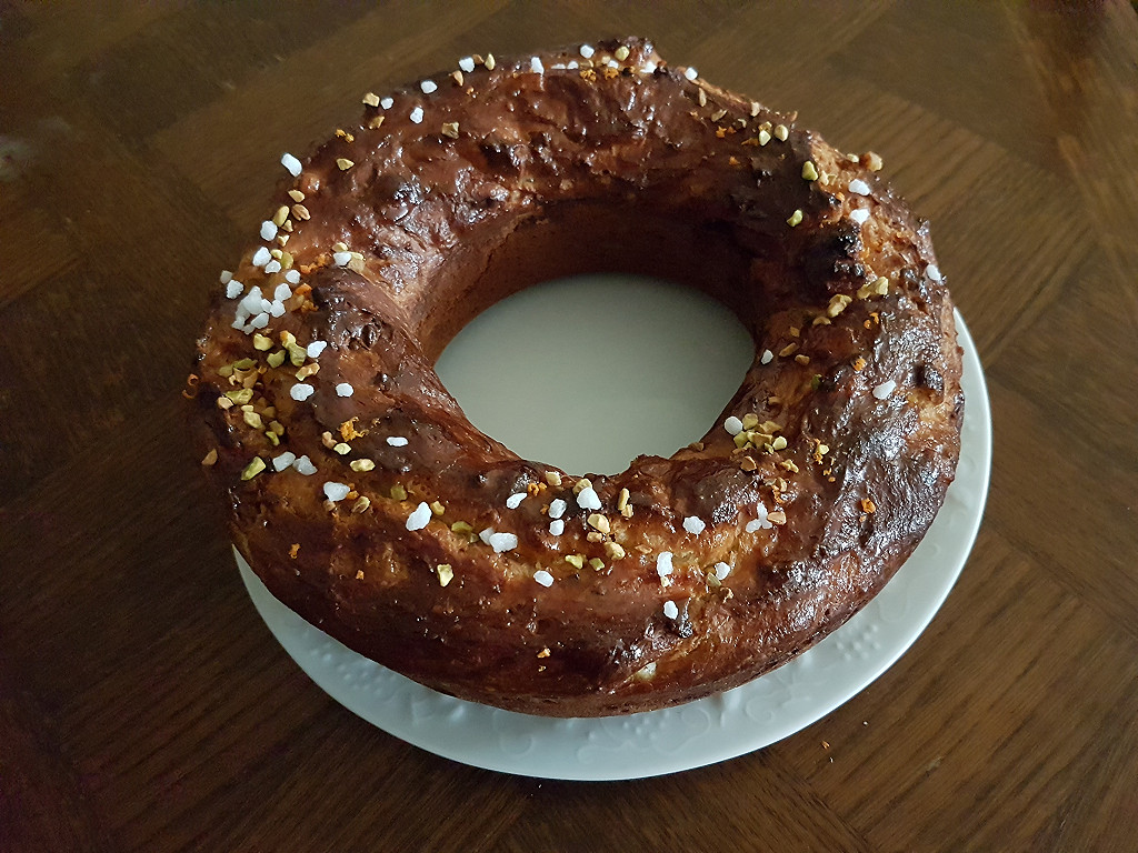 4. Sortez la pâte et formez une couronne sur une plaque recouverte de papier cuisson. Laissez lever de nouveau pendant environ 30 minutes.