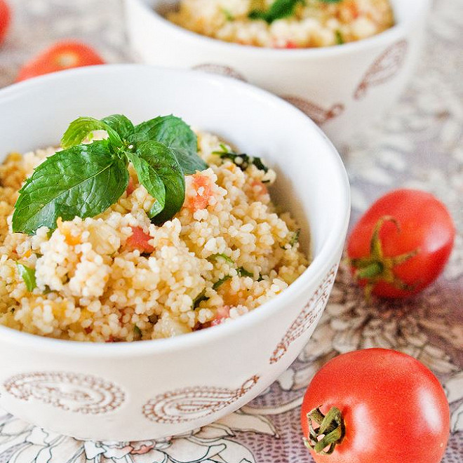 3. Une fois la semoule prête, ajoutez les légumes coupés, la menthe et le persil hachés finement dans le bol.